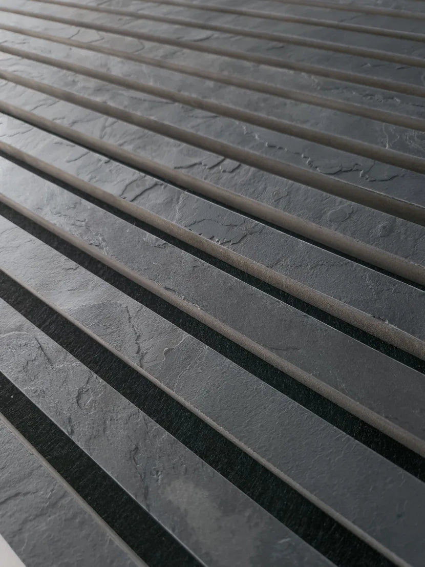 AKUROCK-Akustikpaneele sind in der Größe 2400x600 mm erhältlich, mit einer Dicke von 23 mm. Diese Paneele sind so konzipiert, dass sie nahtlos aneinandergefügt werden können, was eine einheitliche und durchgehende Optik ermöglicht.