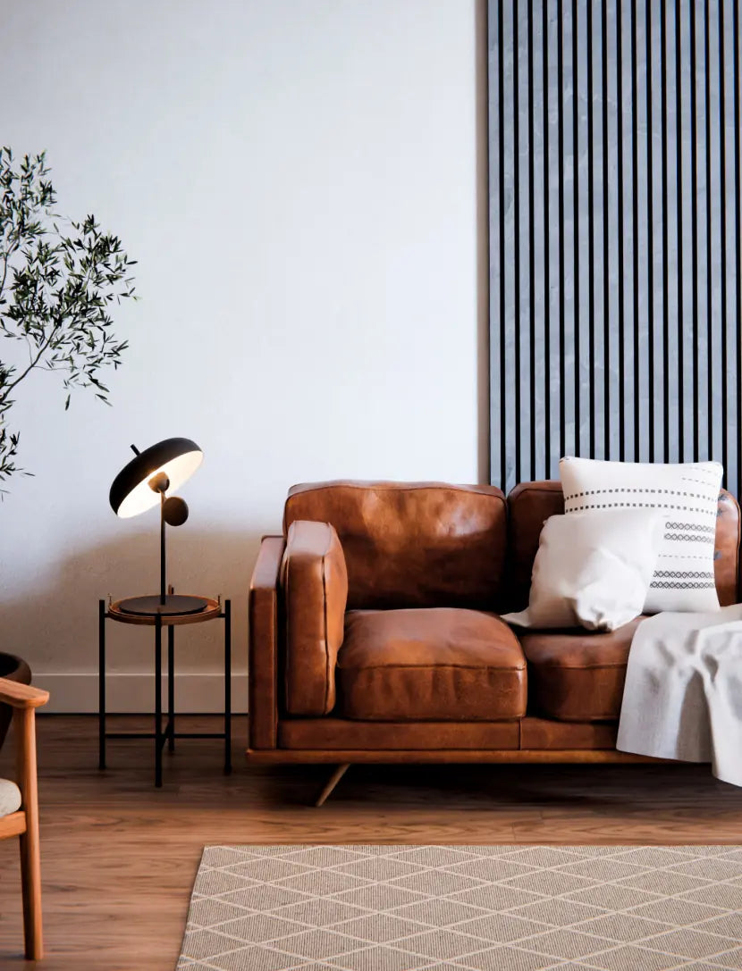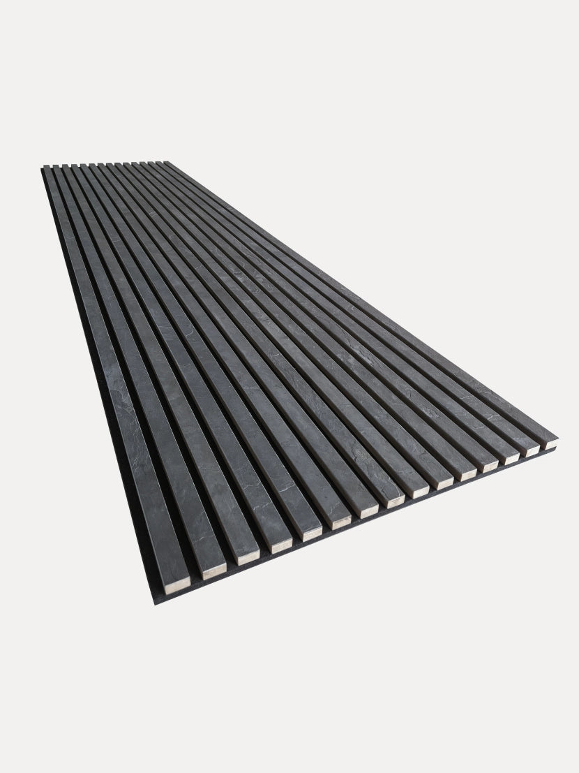 Das Akustikpaneel besteht aus einem 9 mm dicken Akustikfilz, an dem die Lamellen befestigt sind. Der Filz wird aus recyceltem PET-Kunststoff hergestellt, hauptsächlich aus Plastikflaschen. Die Lamellen bestehen aus MDF mit einer echten Steinfurnieroberfläche. Unser gesamtes Holz stammt aus nachhaltiger Forstwirtschaft. Dabei wird sichergestellt, dass mehr Bäume nachwachsen, als gefällt werden.